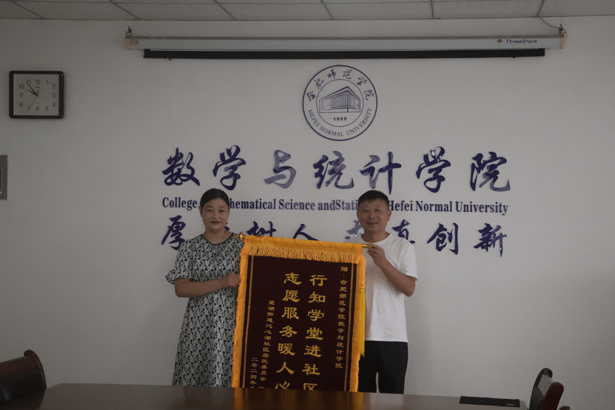 9月19日上午,包河区沁心湖社区党委书记、社居委主任王康,居委委员许华靓,团总支副书记何凯阳一行三人到永利集团304am登录赠送锦旗。“非常感谢永利集团304am登录对沁心湖社区的大力支持,我们代表社居委及社区居民为学院送上锦旗。”王康将“行知学堂进社区 志愿服务暖人心”的锦旗送到学院党委书记穆娟手中,表达了对学院的感谢之情。
