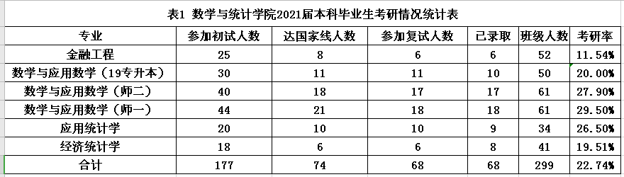 本网讯 在近期刚刚落下帷幕的2021届研究生考试中,永利集团304am登录学子考研喜获佳绩、再创新高。全院共有74名毕业生初试通过国家线,68人成功考取研究生,考研率达22.74%。其中数学与应用数学(师范)、应用统计学、数学与应用数学(专升本)专业更是以28.68%、26.47%和20.00%的考研率刷新了专业考研率的历史新高。